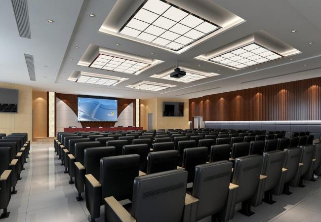 報(bào)告廳設(shè)計(jì)裝修形式為:吊頂中間部分為正方形鋁格柵吊頂內(nèi)嵌燈帶,四周為平面吊頂;舞臺后墻0.3m以上為軟包材料,下做木墻裙;舞臺兩側(cè)音控室墻面為通高裝飾櫸木板;兩側(cè)墻及后墻1.4m以上為軟包材料,1.4m以下